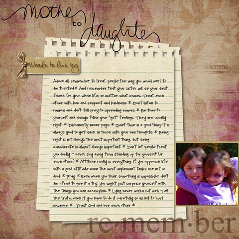 Above all, remember to treat people the way you would want to be treated.* And remember that your sister will be your best friend for your whole life, no matter what comes. Treat each other with love and respect and kindness. * Don’t listen to rumors; and don’t fall prey to spreading rumors. * Be true to yourself and always follow your "gut" feelings. They are usually right. * Dishonesty never pays. * Quiet time is a good thing. It is always good to get back in touch with your own thoughts. * Being right is not always the most important thing, but being considerate is almost always important. * Don’t let people treat you badly – never shy away from standing up for yourself (or each other) * Attitude really is everything. If you approach life with a good attitude even the most unpleasant tasks are not so bad. * Pray * Even when you think something is impossible, don’t be afraid to give it a try. You might just surprise yourself with the things you can accomplish. * Lying never works out well. Tell the truth, even if you have to do it carefully so as not to hurt someone. * Trust God and love each other *
