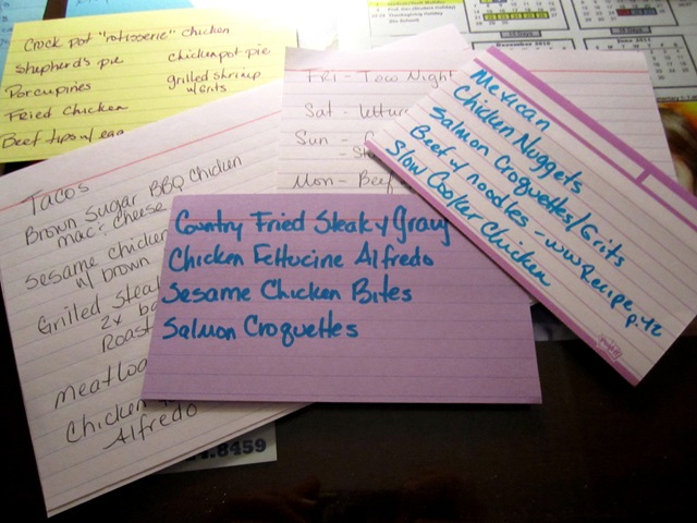 Finally, I write my plan. I have used many things for this before, but what I have found works best for me is to use index cards. I use the big ones – either 5×8 or 4×6 so that I have room to write with a bold felt tip marker. This is because I’m getting old and I want to be able to read the stupid thing when it is hanging on the refrigerator and I’m in the kitchen trying to remember what I’d planned for dinner that night.