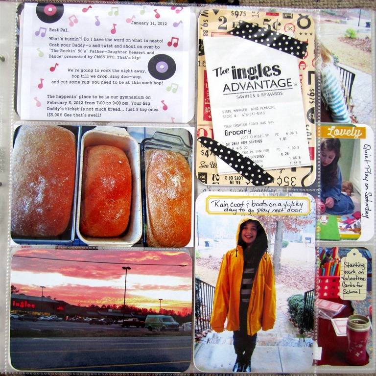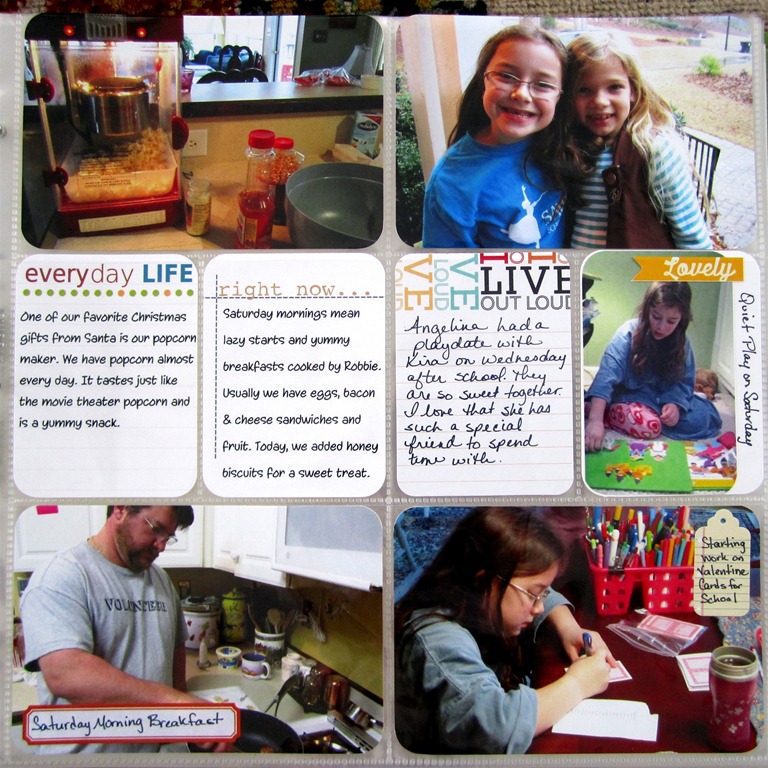 Here are the pages I have for last week. I ended up doing a 12×10 insert with some extra pictures from the week, including the Father-Daughter Dance pictures. I will probably end up going back and including a 5×7 of that one since SuperMan had a formal picture made of him with the girls at the dance. I can’t wait to see it.