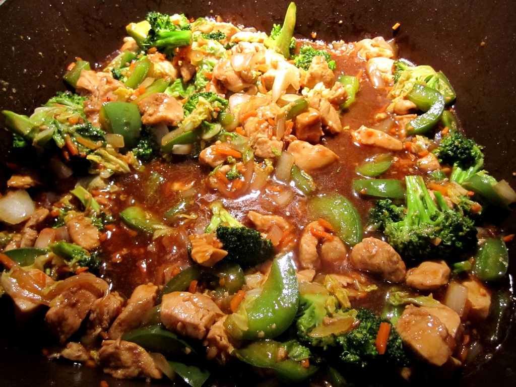 - Pour the sauce mixture over the vegetables & chicken. Stir to coat everything thoroughly and let simmer for a few minutes to thicken.