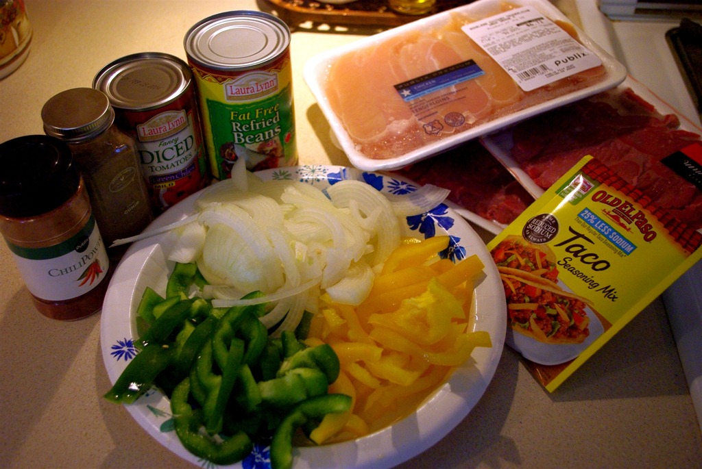 I cut my chicken tenders into smaller, thinner slices. Sometimes I do the same for the meat (depending on how thick it was cut at the store). I slice my onion thin and the bell peppers I leave a little thicker because I like that taste when I bite into my fajita. The refried beans I don’t put in the fajita meat when they are cooking, but I do heat them and serve them on the side to put in the fajita when it’s made at the table.