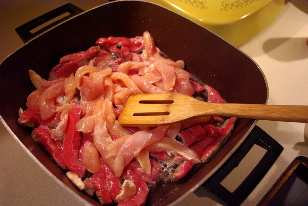 I put all the meat in together. It’s probably not how the Food Network folks would do it, but I (am lazy) don’t have time to cook each part separately and put it aside while I cook the rest. Just toss it all in, I say.