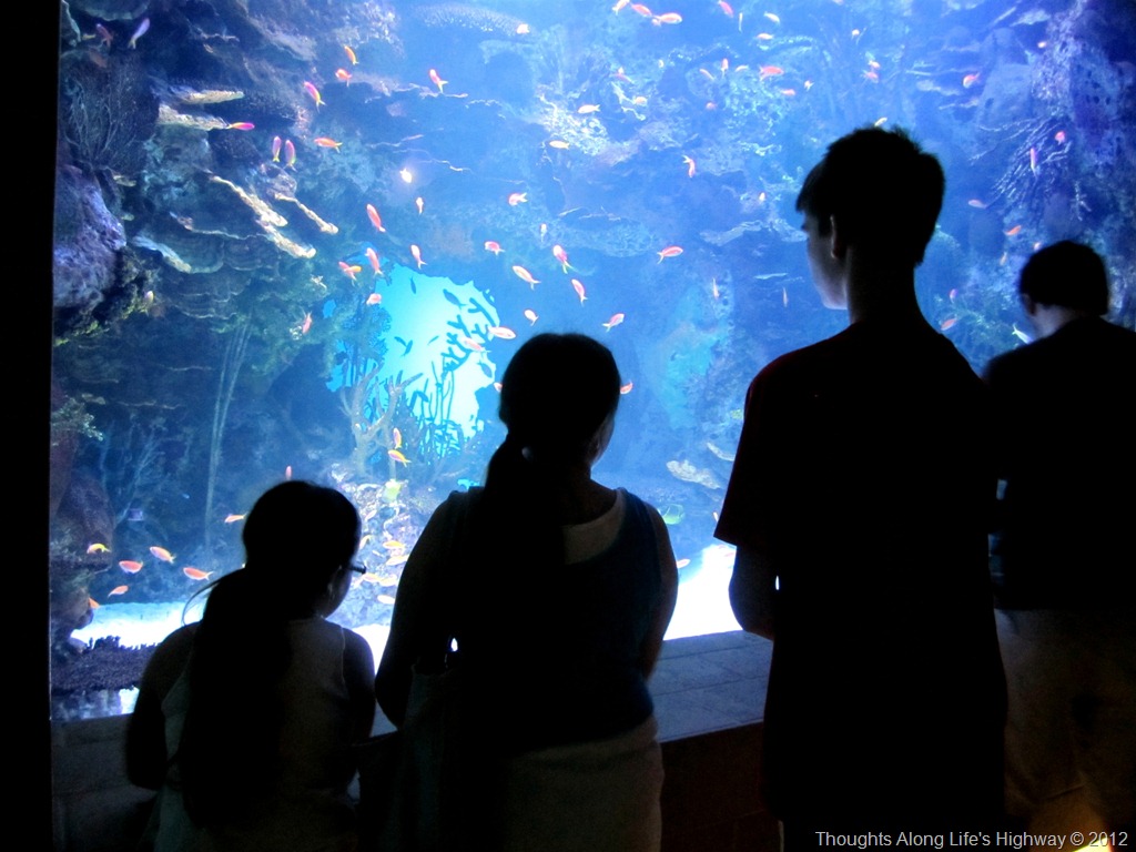We had a great time – loved watching the fish – especially the whale sharks. Here we got to ride on a conveyor belt (“people mover”) through a tunnel that went through the large tank with the whale sharks. There were divers swimming above us (with the sharks) and the kids loved that.