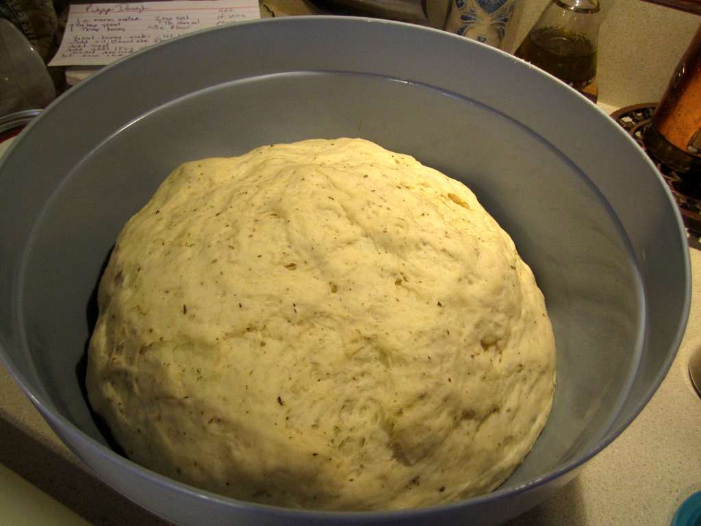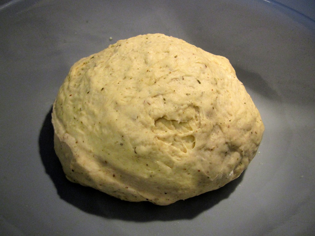 6. Lightly oil the mixing bowl and put the dough ball back in.  Cover with a towel and let rise in the for 45 minutes to an hour. (preheat your oven while dough is rising)
