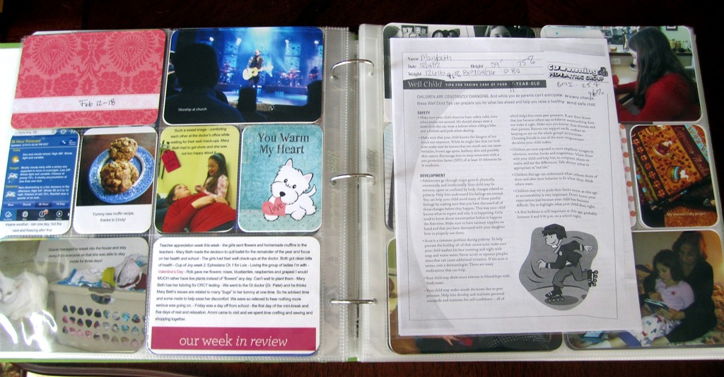 Here’s the two page spread with an insert that shows the girls’ well-check up information. I thought it would be fun to record/save their weight/height info for posterity. (you can click on the image to see it bigger)