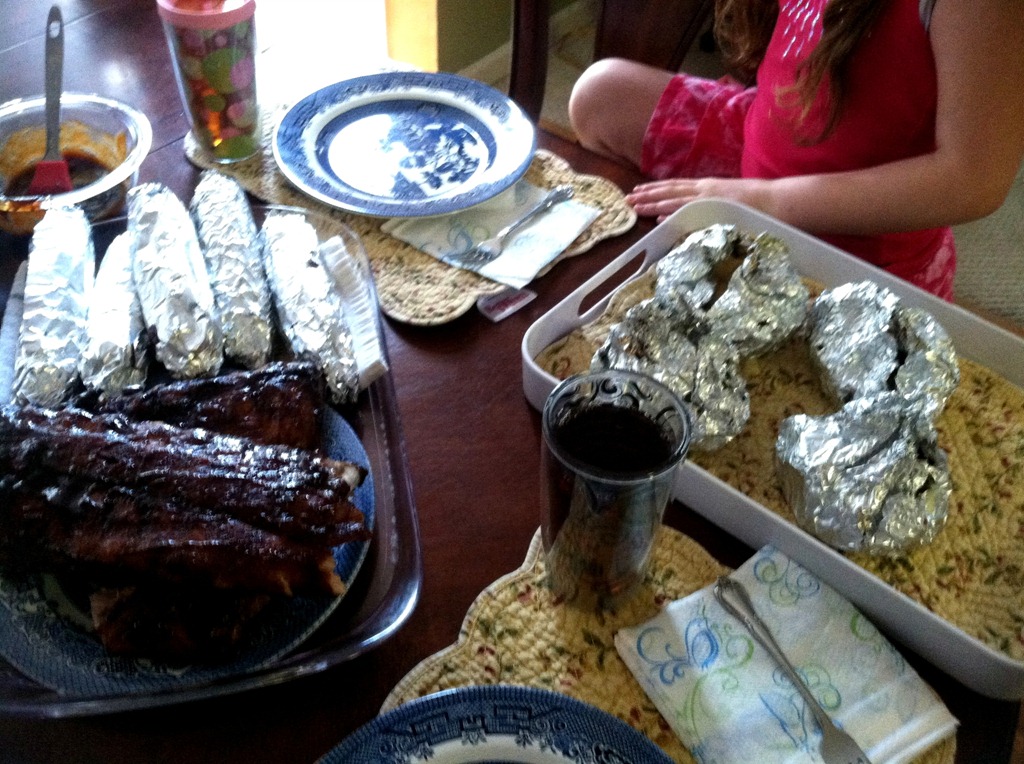 We grilled ribs, corn (wrapped in foil and slathered with butter) and the potato pockets. It was a yummy, yummy dinner. Made especially good because there were very few dirty pots to wash. (my dishwasher is dead)
